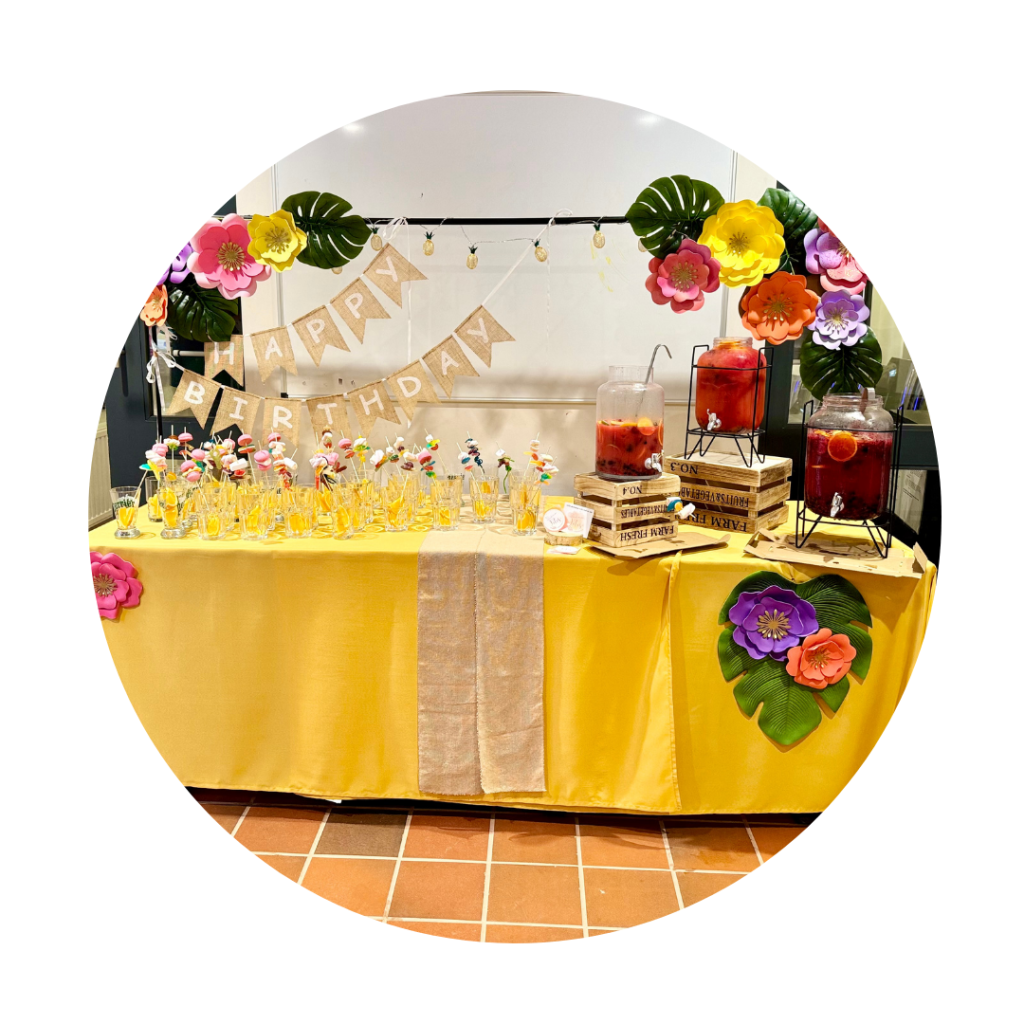 - une table entièrement scénographiée et personnalisée selon le thème de votre fête, pour votre table de cocktail, dessert buffet, …